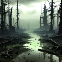 Beschreibung: Ein düsterer Sumpf mit dichtem Nebel, der die Sicht einschränkt.